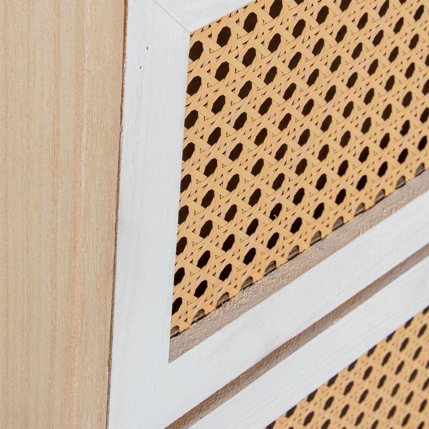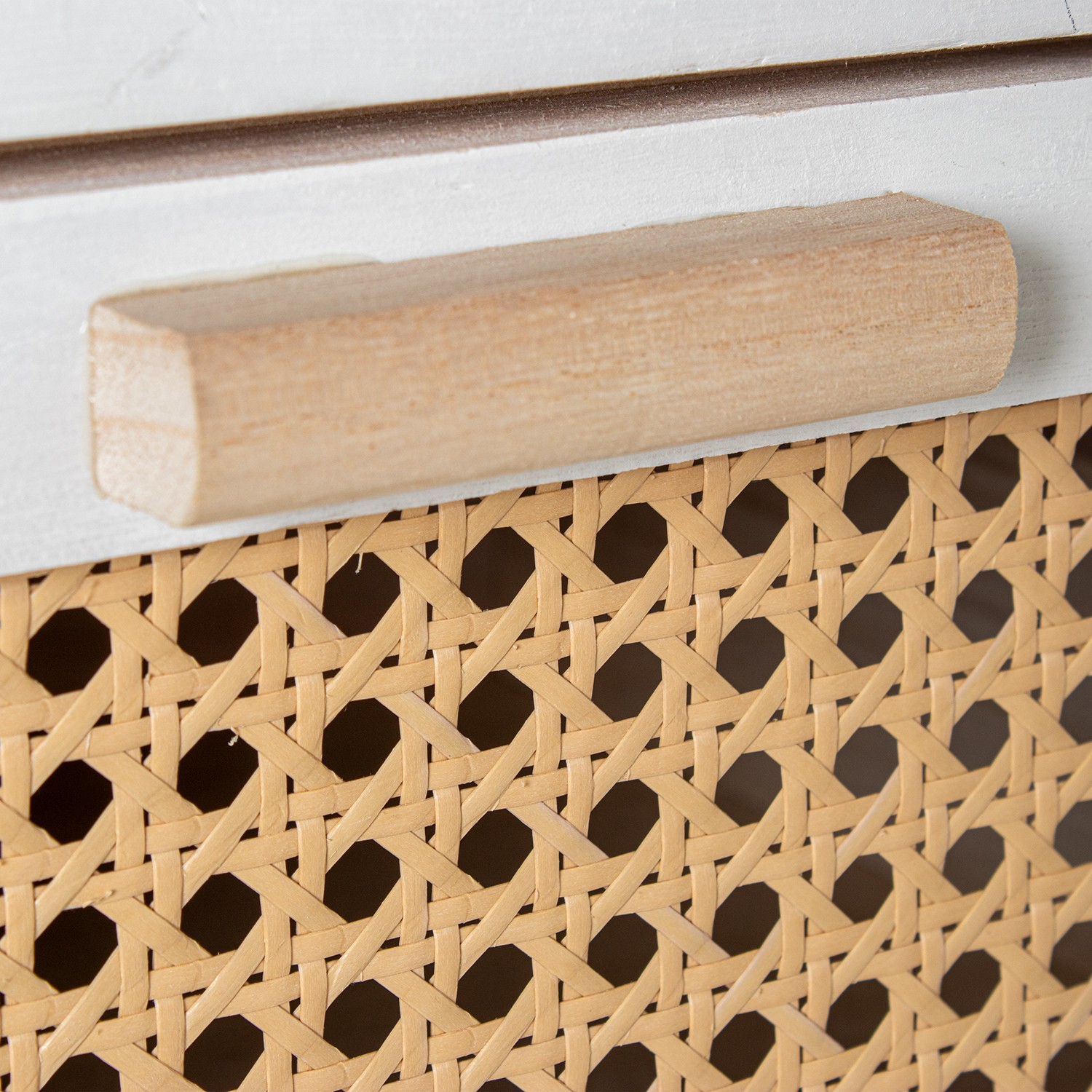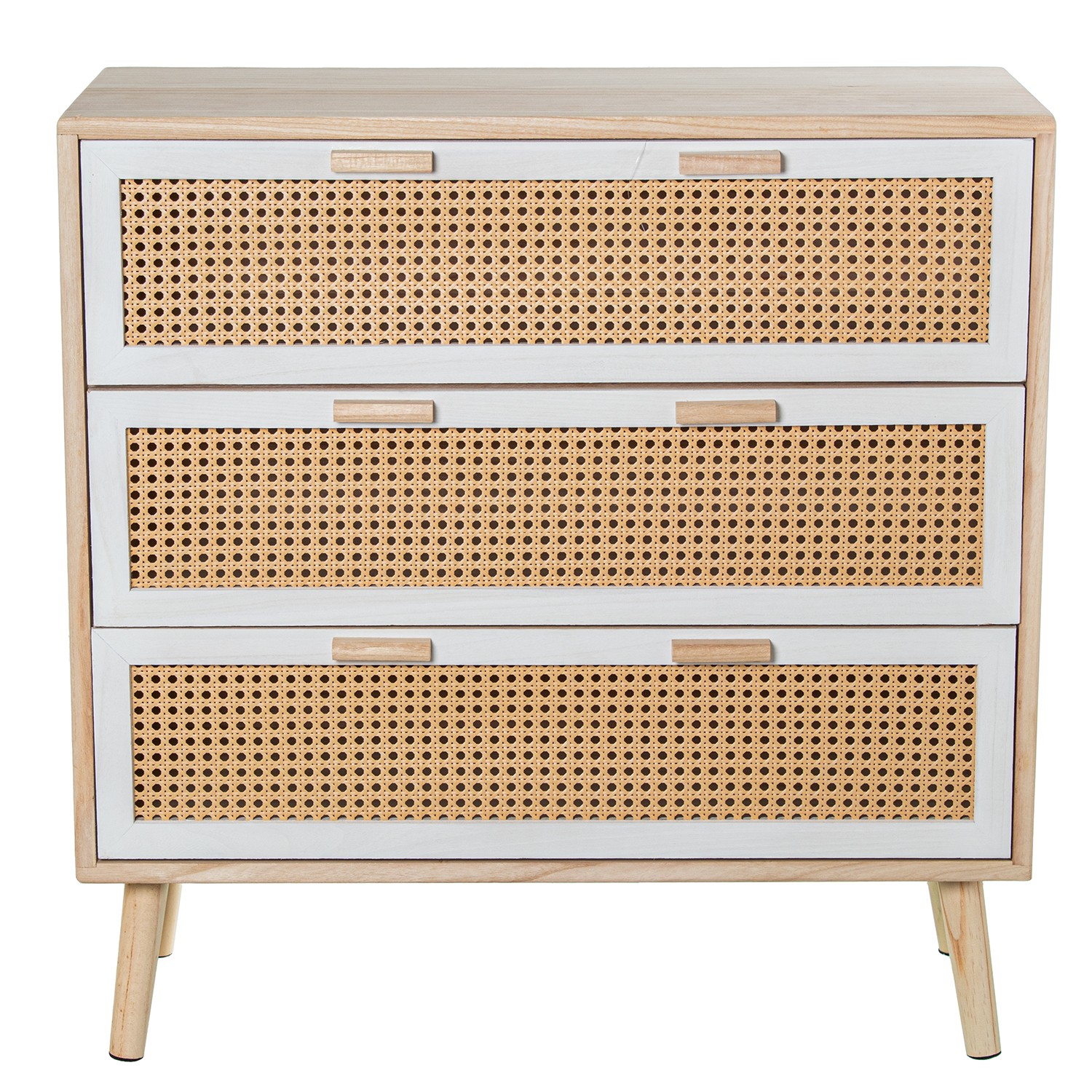 Cómoda de 3 cajones en madera natural y lacado, con toques de ratán. Decora tus estancias con esta cómoda que combina funcionalidad con estética.