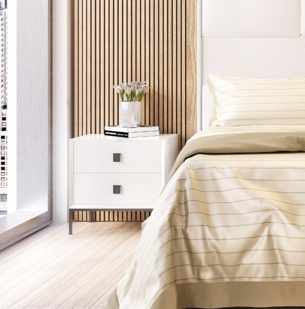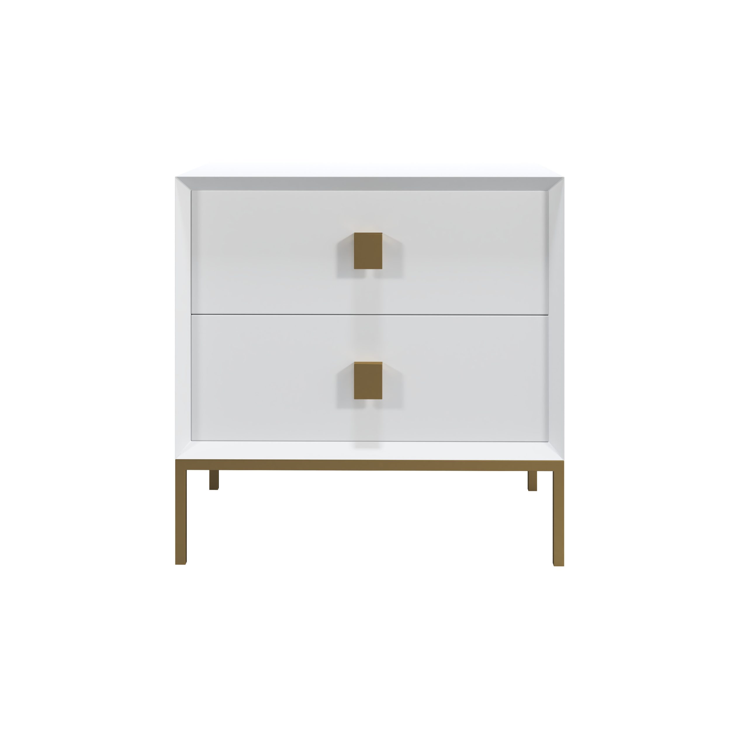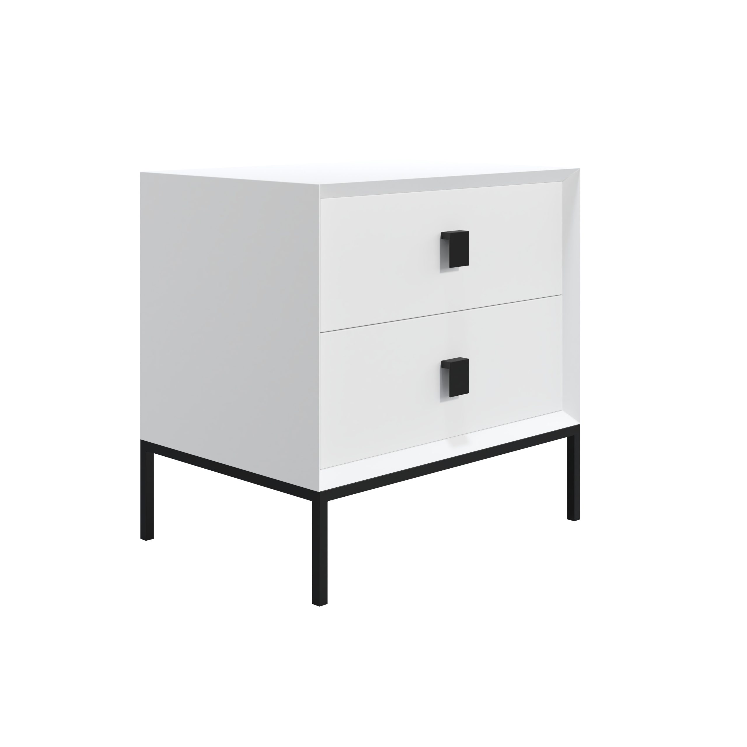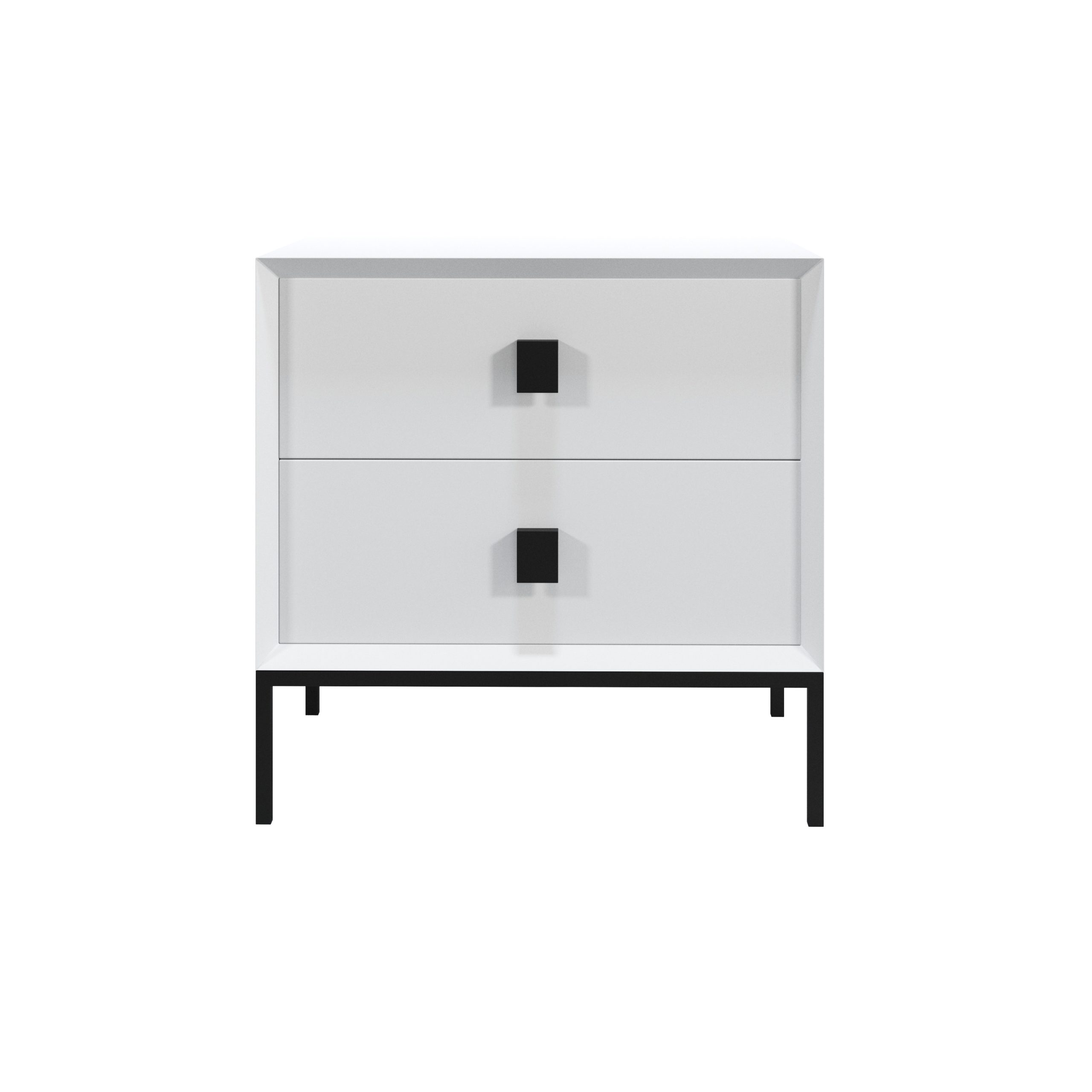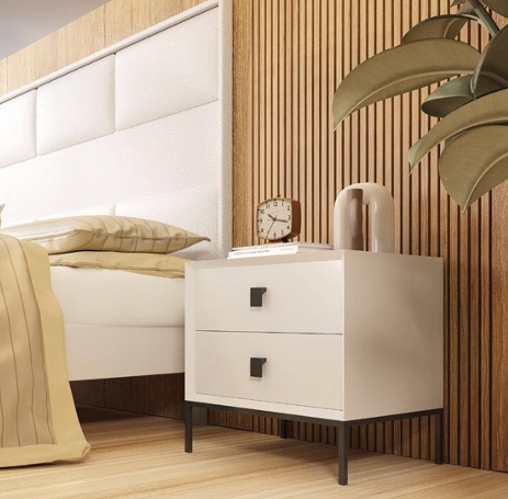 Mesita de noche lacada, acabados personalizados. Doble cajón y patas metálicas de diseño. Decora tu dormitorio con esta mesita que combina funcionalidad con estética.