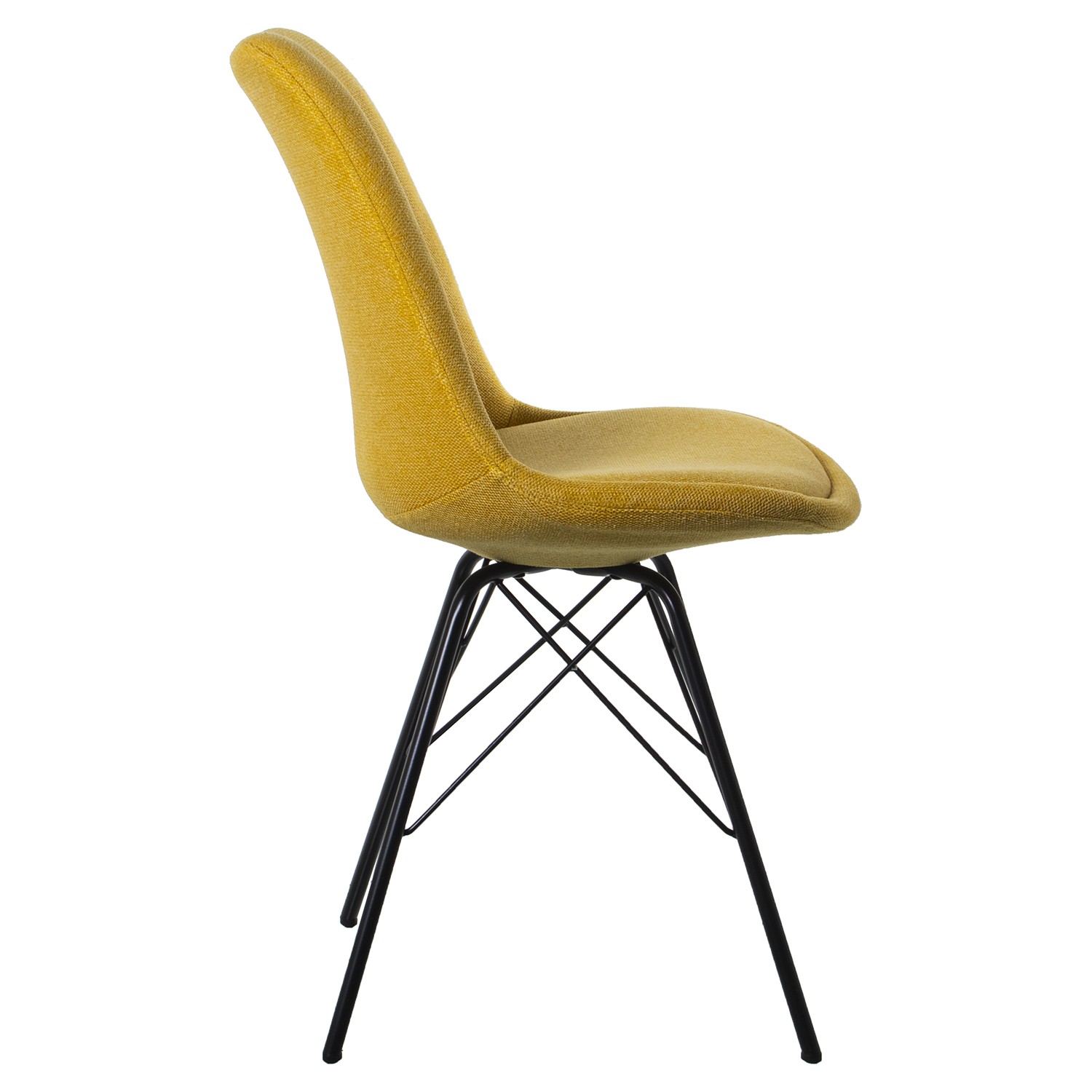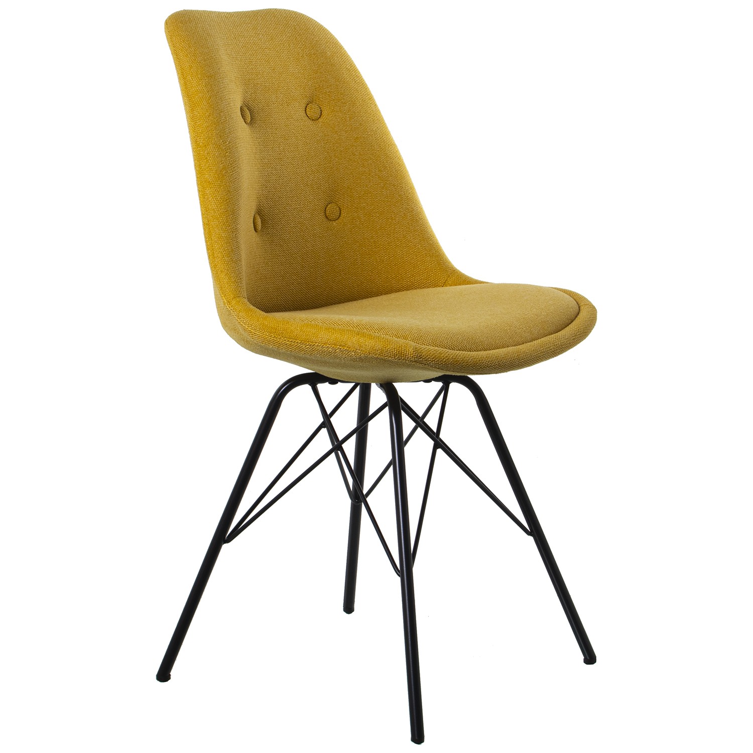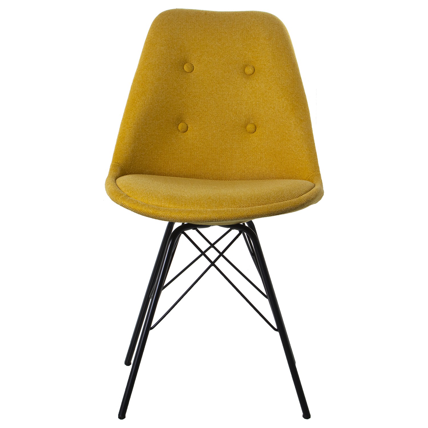 Silla tapizada en tejido poliéster. Patas metálicas negras.