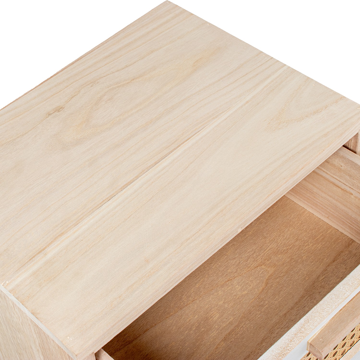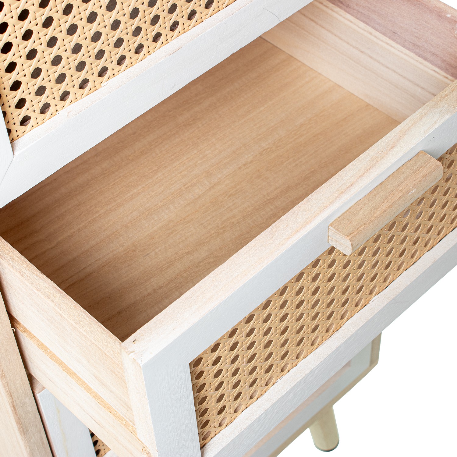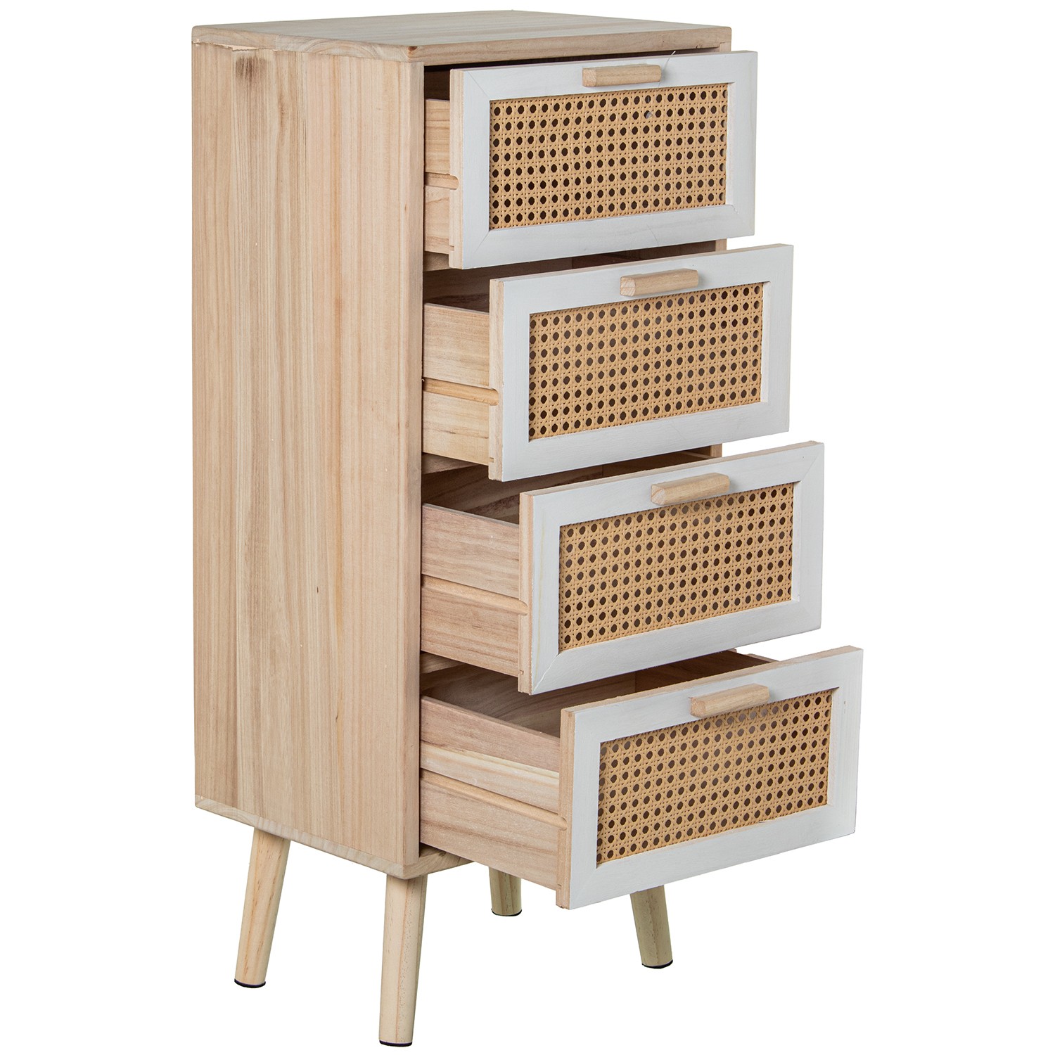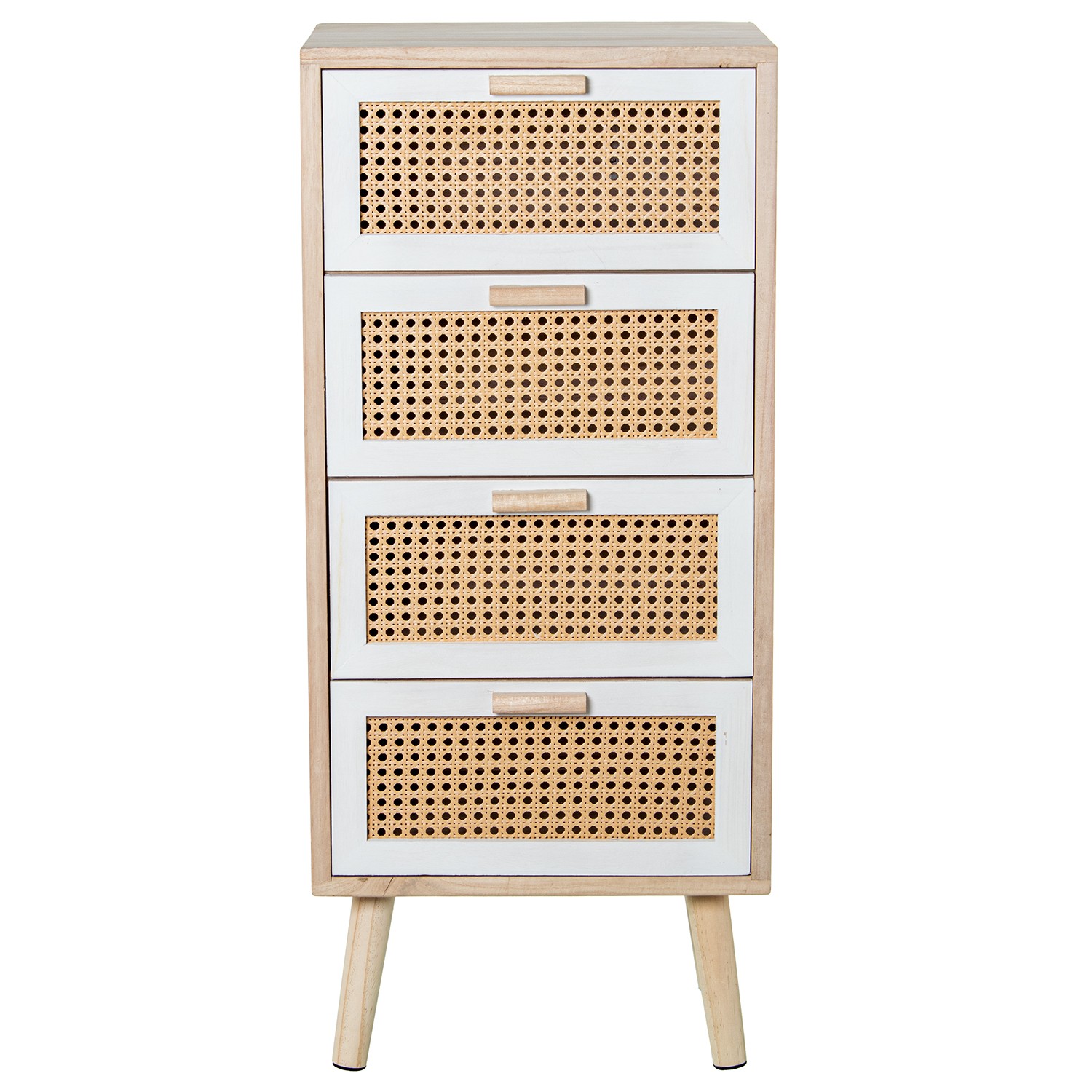 Sinfonier de 4 cajones en lacado y madera natural con toques de ratán. Decora tus estancias con esta cómoda que combina funcionalidad con estética.