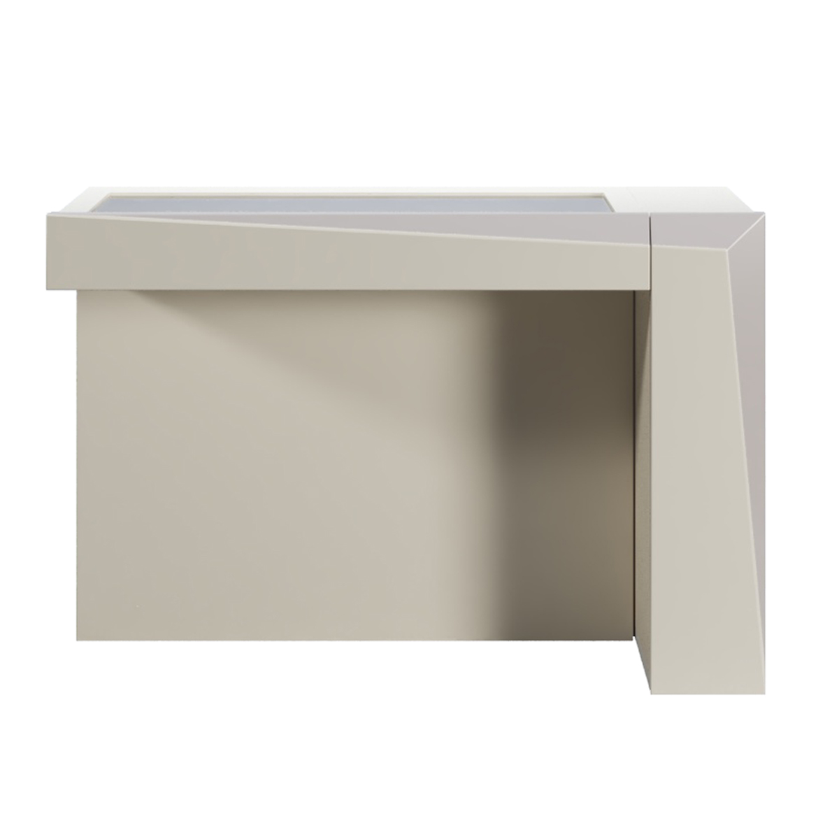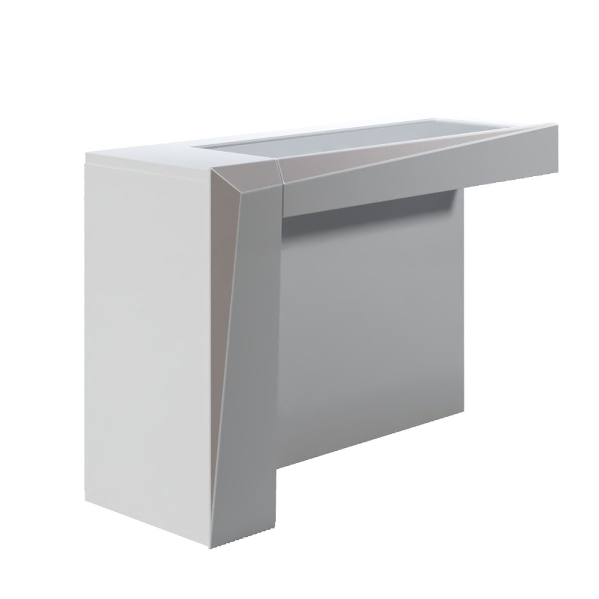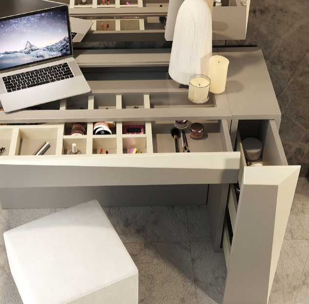 Mueble organizador y expositor para productos cosméticos. Dispone de un cajón expositor con divisores para mayor organización. En la parte derecha dispone de un cajón alto para más almacenaje.