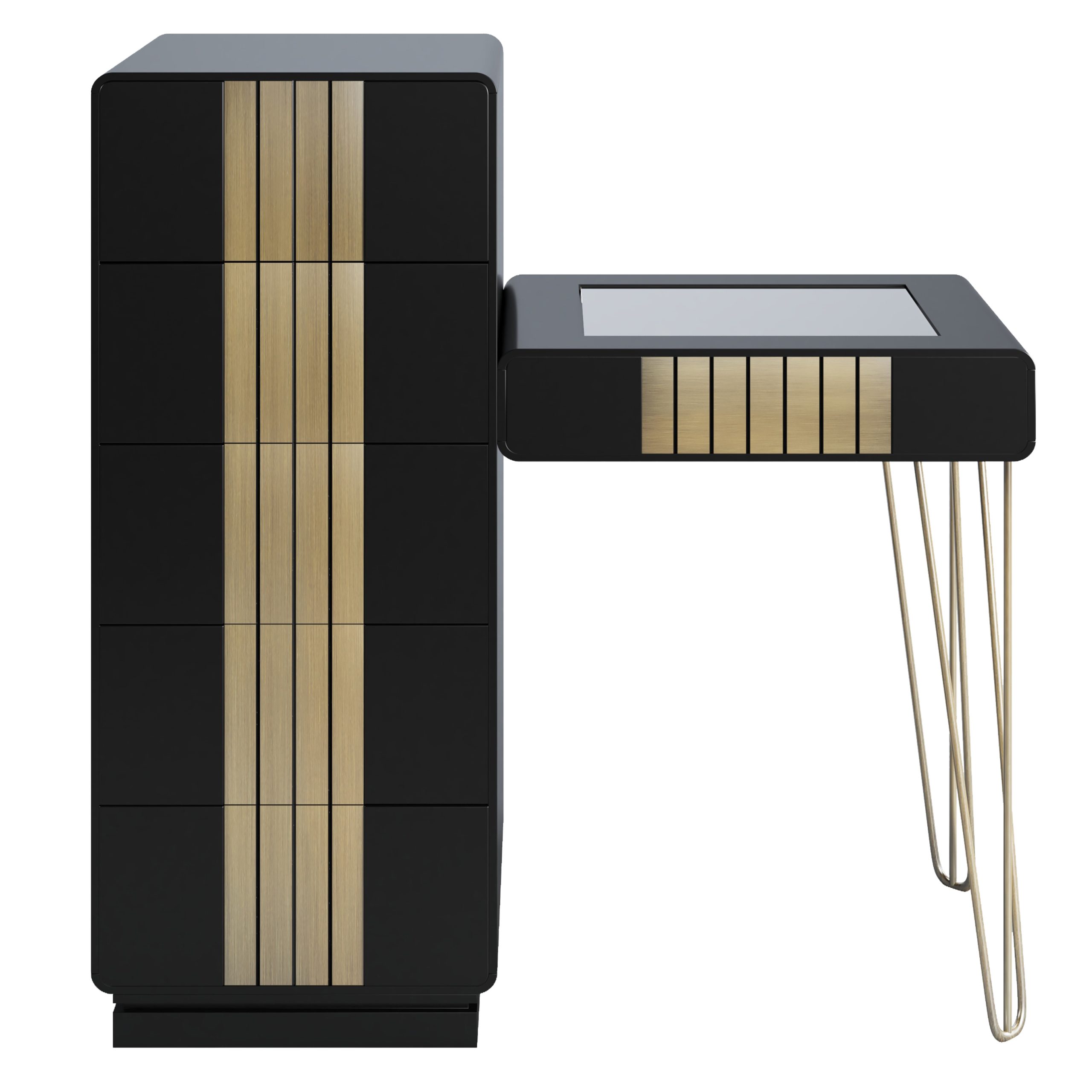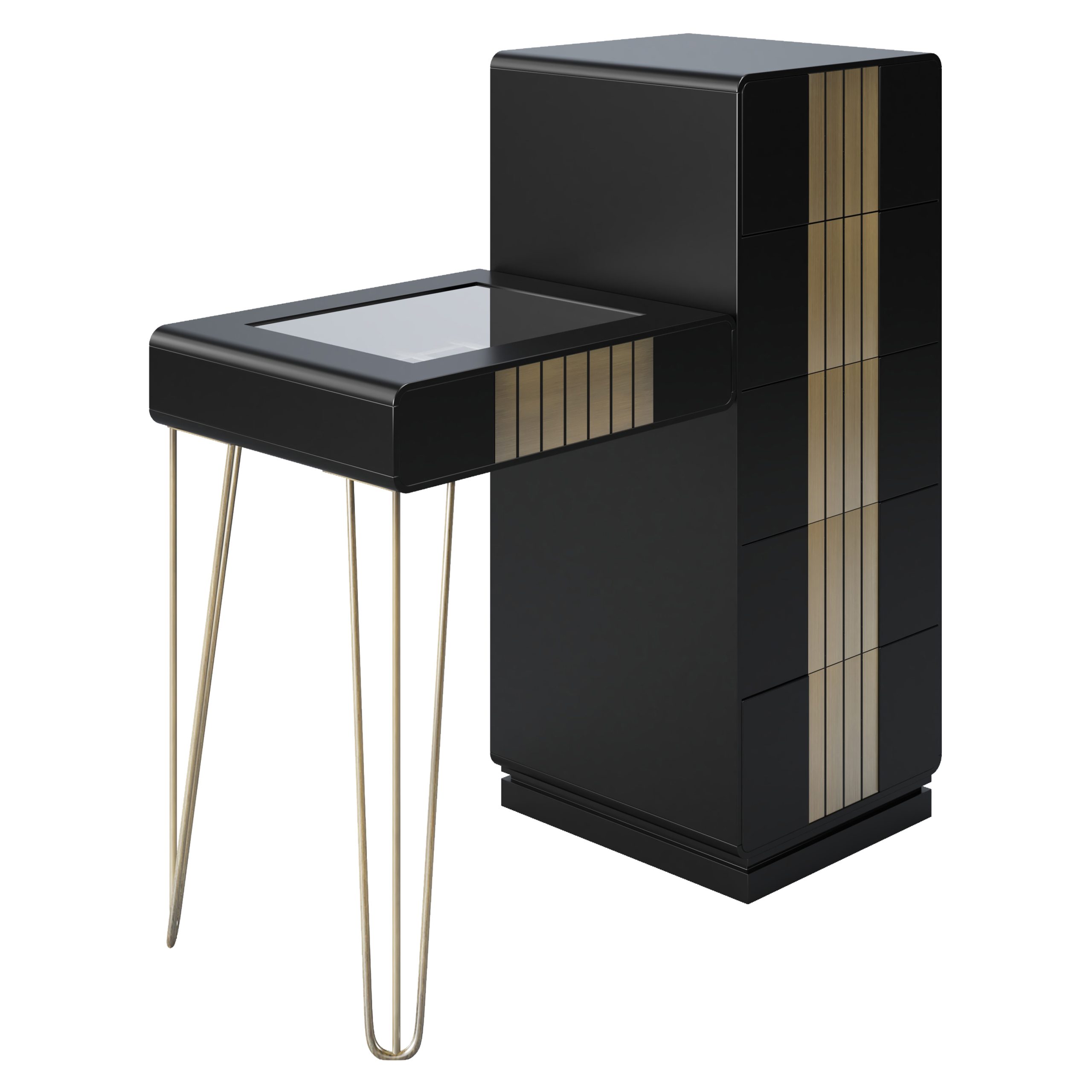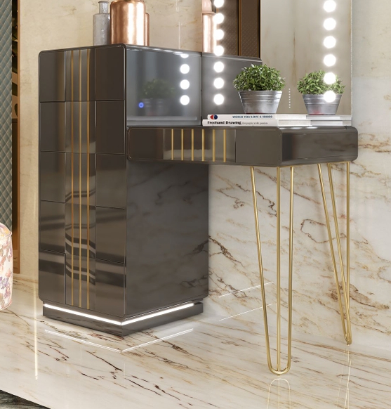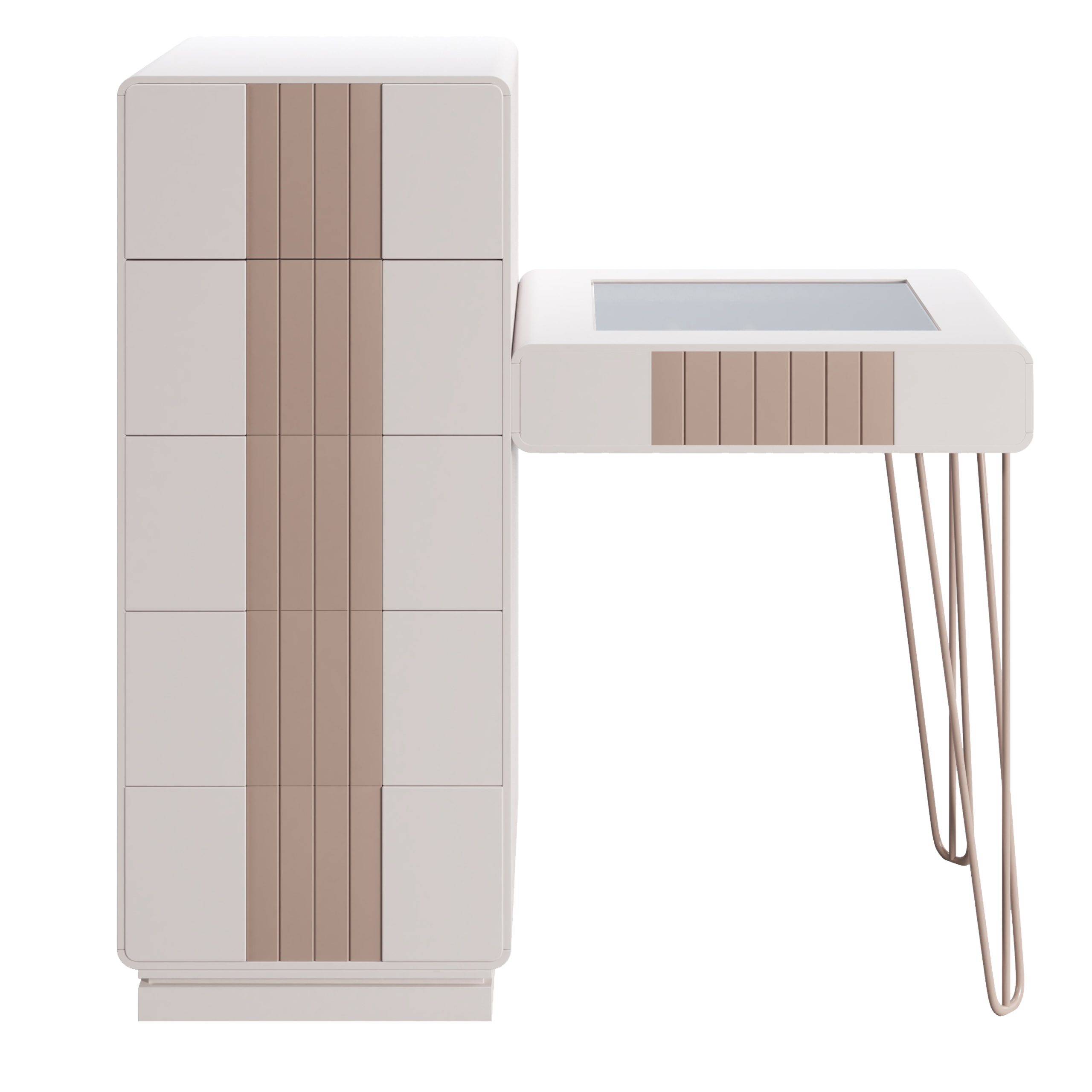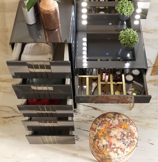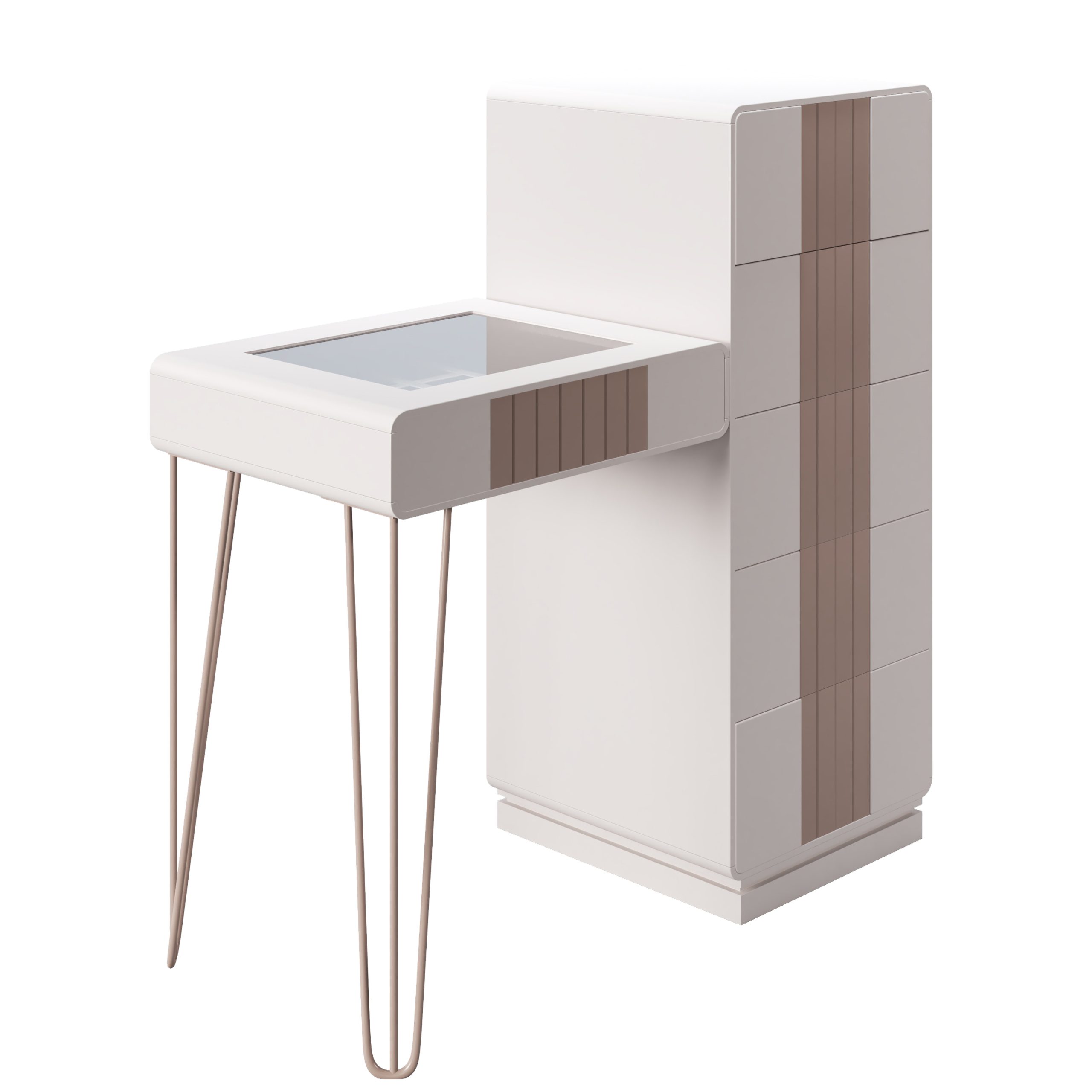 Mueble organizador y expositor para productos cosméticos. En la parte central dispone de un cajón expositor con divisores para mayor organización. En la parte izquierda dispone de una cajonera muy amplia con  5 cajones para más almacenaje.