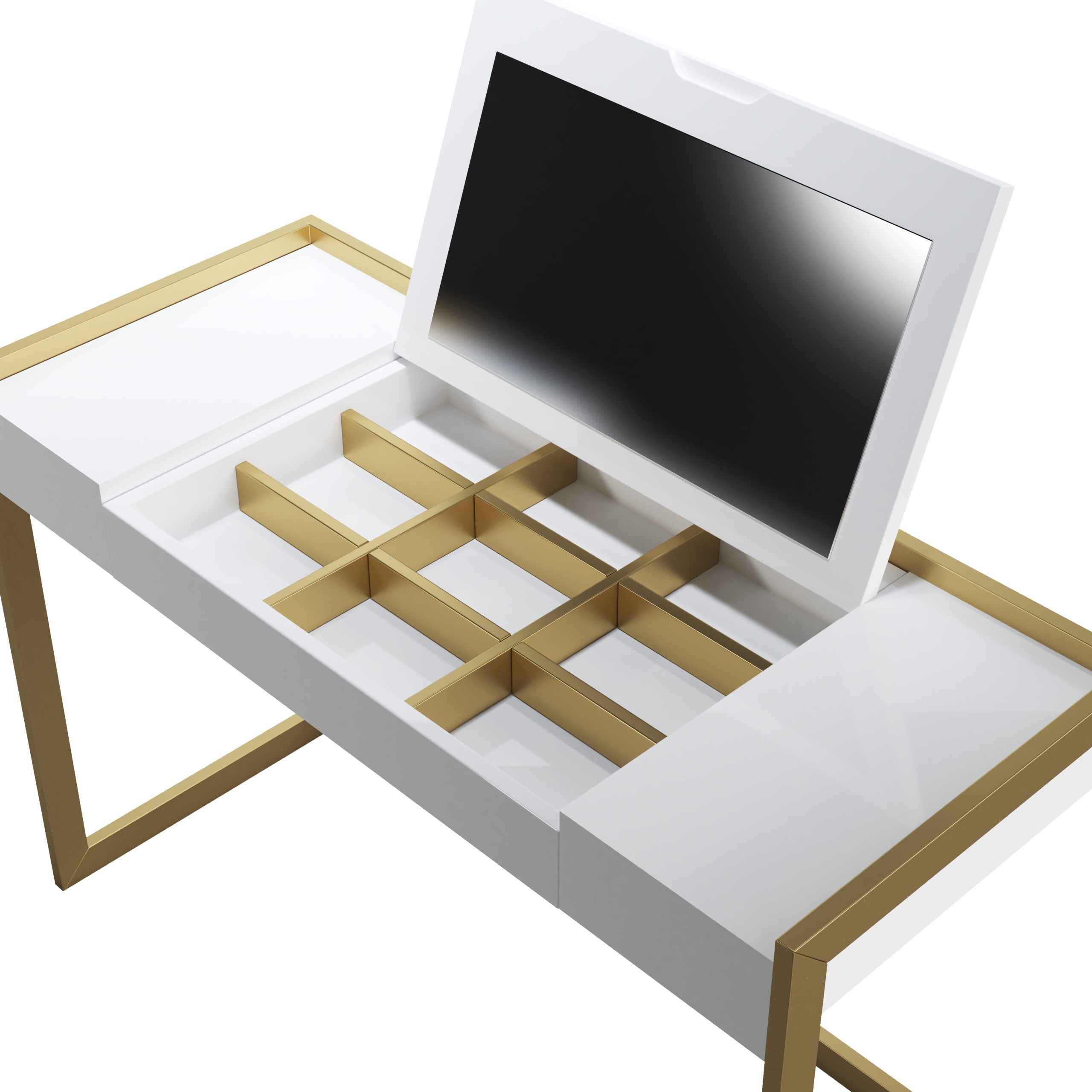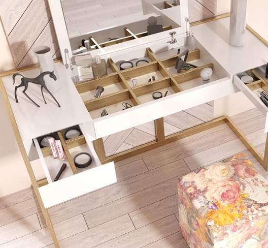 Mueble organizador y expositor para productos cosméticos. En la parte central dispone de una tapa con espejo que al abrir descubre un expositor con divisores para mayor organización.